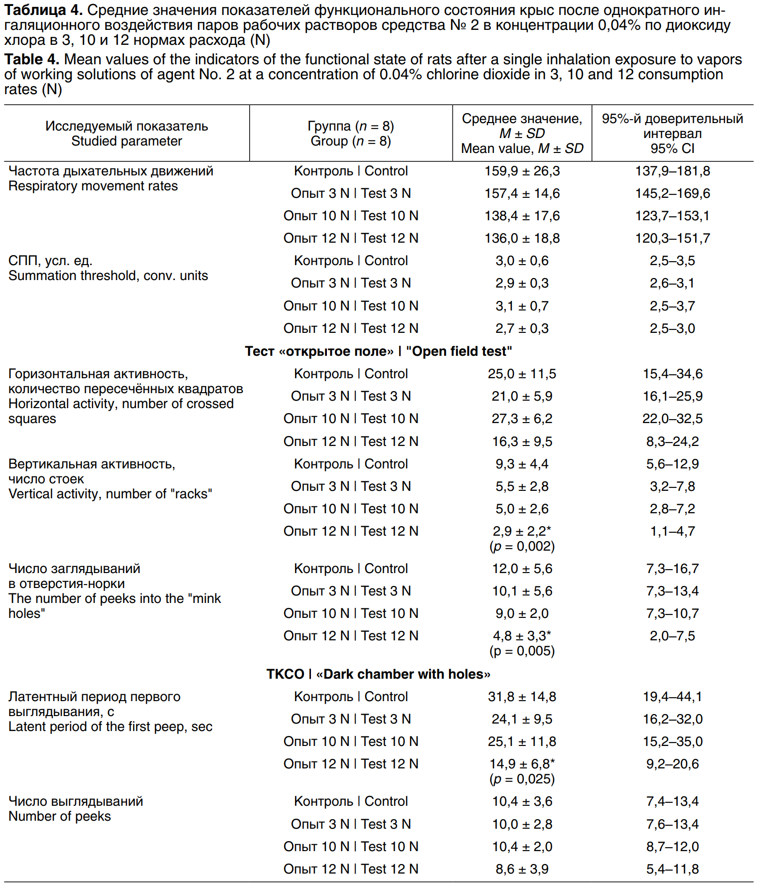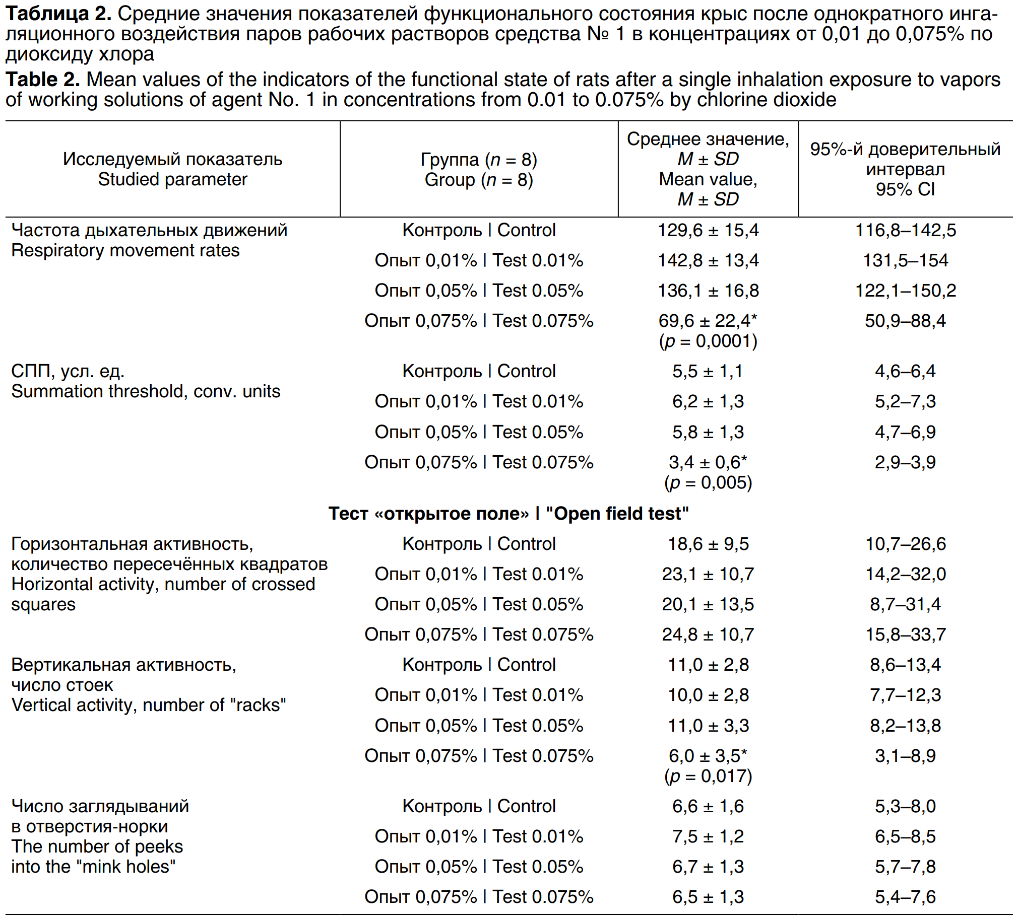Токсичность рабочих растворов средств изучали в затравочных камерах объёмом 0,5 м3. Исследования проводили на белых беспородных крысах-самках (n = 8/группа, масса тела 280–320 г). Для выявления интоксикации использовали показатели функционального состояния отдельных органов и систем. Функции нервной системы изучали по суммационно-пороговому показателю (СПП)2, исследовали поведенческие реакции, которые характеризуют регулирующую, интегрирующую, координирующую функции центральной нервной системы3. В экспериментах использовали тест «открытое поле», позволяющий оценить двигательные компоненты (горизонтальный и вертикальный) ориентировочной реакции, норковый рефлекс, который определяется исследовательским рефлексом, и тест «тёмная камера с отверстиями» (ТКСО), показывающий исследовательскую активность животных, не модулированную страхом.