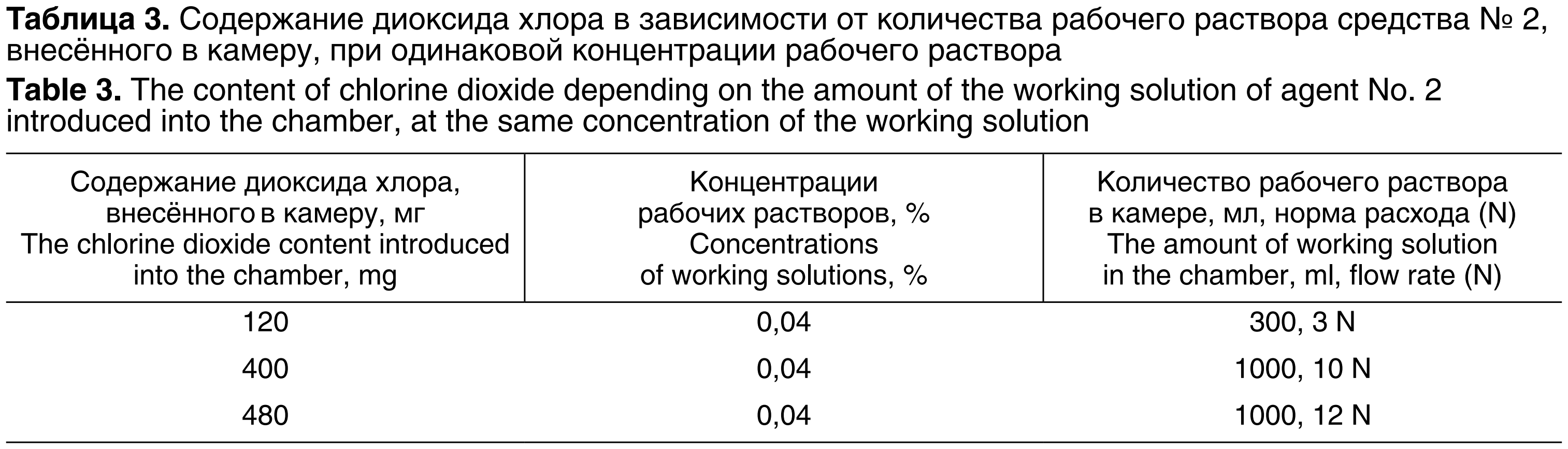 Важно, что при внесении в камеру 75 мг диоксида хлора рабочего раствора средства № 1 в концентрации 0,075% наблюдали изменение частоты дыхания и поведенческих реакций экспериментальных животных, а при внесении в камеру 400 мг диоксида хлора рабочего раствора средства № 2 в концентрации 0,04% изменений показателей интоксикации не отмечали.