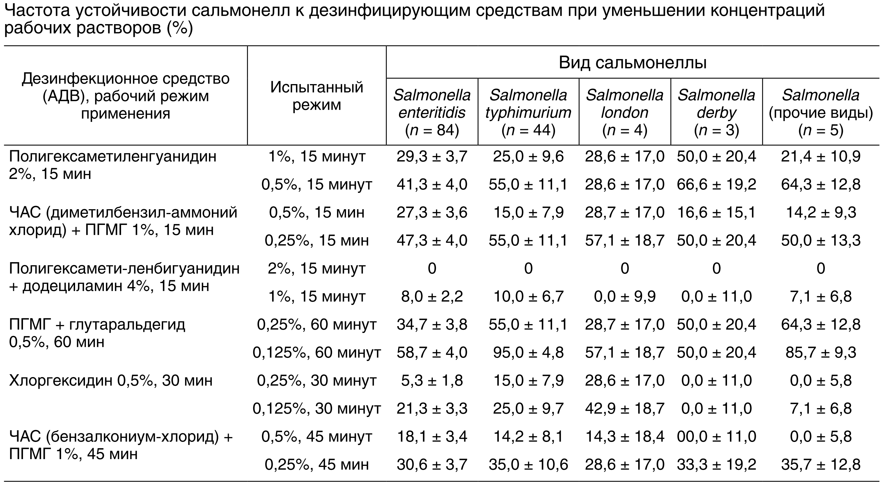 В результате проведённого исследования было установлено, что при снижении концентрации ДС в два раза штаммы Salmonella имели устойчивость к этим режимам: от 0,00% до 64,3% случаев. Наибольшей эффективностью характеризовался хлоргексидин и комбинированный дезинфектант на основе ПГМГ и додециламина. Снижение концентрации растворов дезинфектантов в четыре раза от рабочих вызвало дальнейшее увеличение частоты выживания культур микроорганизмов.