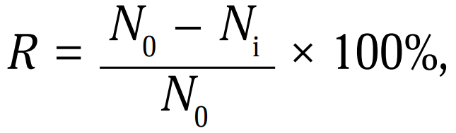 Для количественной оценки антимикробного действия был предложен показатель снижения количества микроорганизмов R, который рассчитывали по формуле (1):