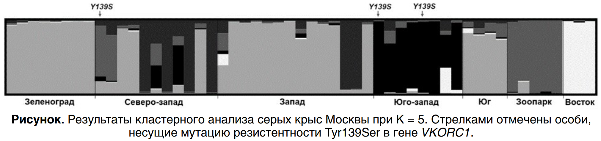 Обмен генов между популяциями серых крыс Юго-Западного (ЮЗАО) и Северо-Западного (СЗАО) административных округов, где ранее была найдена мутация Tyr139Ser [5], оказался незначительным. Это указывает на независимое приобретение резистентности в колониях серых крыс СЗАО и ЮЗАО. Сохранившиеся природные экосистемы города повлияли на уровень изменчивости и обособленности отдельных популяций серых крыс Москвы. Так, зверьки в ВАO и ЮЗАО Москвы, отловленные недалеко от обширных природных зон, характеризовались более высокой генетической изменчивостью и обособленностью в отличие от крыс других районов города. По данным кластерного анализа была выявлена гетерогенность популяции серых крыс СЗАО Москвы (рисунок). Вероятно, в формировании этой популяции принимали участие особи разных колоний города. В СЗАО расположено множество водных объектов, что позволяет крысам обитать в более комфортной среде, так как источники воды служат основным критерием расположения больших колоний вида. Для выборок из других районов города (ЗАО, ЮАО) установлено, что урбанизация значительным образом повлияла на уровень генетической изменчивости. Возможно, колонии серых крыс в этих частях города подвергаются прессу урбанизации в большей степени, и это может отражаться на сокращении их численности и фрагментации ареала. В ЦАО (территория зоопарка) на структуру популяции и её изменчивость, по-видимому, повлияла регулярная инвазия крыс при транспортировке животных. По данным кластерного и дискриминантного анализа (рисунок), выборки из ЗеАО, ЮАО, ЗАO по структуре были сходны между собой. Крысы ЗеAO, предположительно, могли составлять основу популяций в ЗАО и ЮАО. В дальнейшем произошла фрагментация их ареала в связи с урбанизацией этих территорий. Нового потока мигрантов фактически не происходило в связи с изолированностью этих районов плотной застройкой и отсутствием природных местообитаний. В настоящее время застройка ЗАО и ЮАО продолжается.